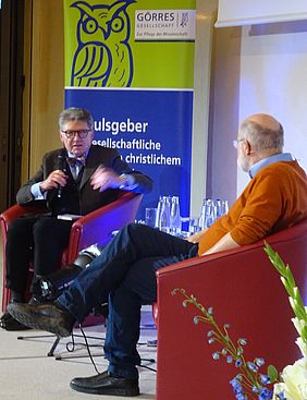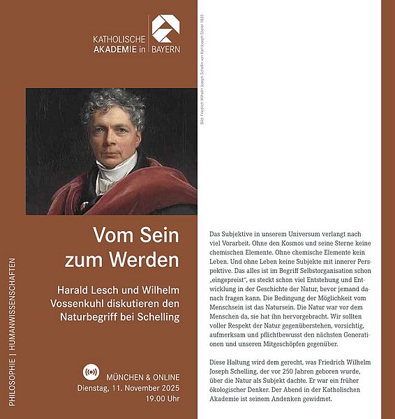 Unter der Überschrift "Vom Sein zum Werden" fand am Dienstag, dem 11. November 2025, ein Vortrags- und Diskussionsabend mit Professor Dr. Harald Lesch, Wissenschaftsjournalist und u.a. Professor für Astrophysik an der Ludwig-Maximilians-Universität München, sowie Prof. Dr. Wilhelm Vossenkuhl, emeritierter Philosophieprofessor an der LMU München, statt. Anlass des Abends war er 250. Geburtstag des Naturphilosophen Friedrich Wilhelm Joseph Schelling (1775 - 1854), der als einer der „frühen ökologischen Denker“ gilt. Die Veranstaltung wurde gemeinsam von der Görres-Gesellschaft und der Katholischen Akademie in Bayern in München durchgeführt. Rund 200 Zuhörerrinnen und Zuhörer im Saal und 70 Personen, die digital zugeschaltet waren, verfolgten den Vortrag Harald Leschs und die anschließende Diskussion.