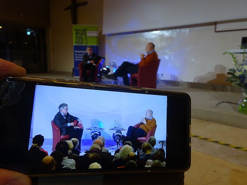 In der anschließenden Diskussion mit Wilhelm Vossenkuhl vertiefte Lesch diese Einsichten am Beispiel der aktuellen Bedrohungen durch Klimawandel und Biodiversitätsverlust. Er wies auf die vielfachen Verflechtungen der natürlichen Systeme hin - etwa der Wasserkreisläufe - wo sich wiederum der Gedanke Schellings zeige: der Fusion vieler Teile zu einem großen Ganzen. Zum Abschluss ihrer Diskussion betonten beide Diskutanten das Primat des Denkens vor der Konstruktion. Gerade angesichts der Herausforderungen durch Künstliche Intelligenz und der Gefahren des “Planeten Internet” sei das selbständige Denken und Hinterfragen mehr denn je gefordert, was Harald Lesch in das Bonmot verpackte: “Denken ist wie Google, nur krasser.”