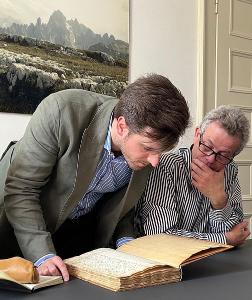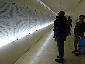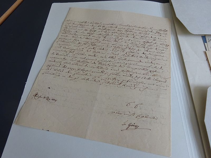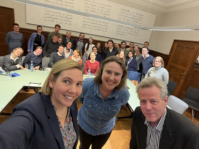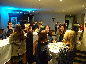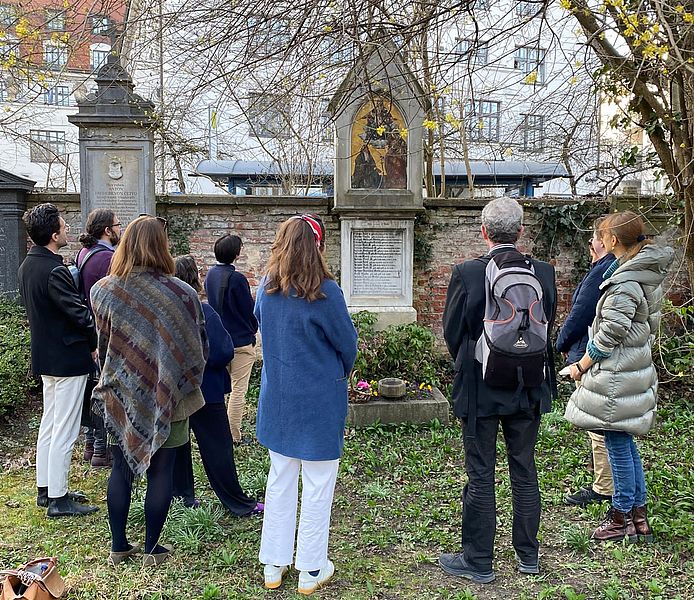 Der darauffolgende Dienstag, 10. März, führte die Gruppe zunächst an die LMU München, wo Juan Montejo außerordentlich fachkundig die Geschichte der Universitätsgebäude erläuterte und insbesondere die Weiße Rose erwähnte, deren Mitglieder im Lichthof verhaftet wurden, nachdem sie Flugblätter von der Empore herab geworfen hatten. Im Anschluss ging es zur Bayerischen Staatsbibliothek, wo Dr. Martin Barth für die erkrankte Görres-Biographin Dr. Monika Fink-Lang ein Porträt Joseph Görres‘ in seinen letzten Münchener Jahren verlas. Sie können den Text hier nachlesen. Im Anschluss zeigten Dr. Maximilian Schreiber und Annemarie Kaindl von der Staatsbibliothek einige „Schätze“, so einen Originalbrief Görres‘ aus dem Jahr 1839 und eine Mitschrift seiner Vorlesungen. Auch der Nachmittag galt dem Namenspatron unserer Gesellschaft, der Weg führte zum Südfriedhof, wo sich die Familiengrabstätte befindet. Hier legten die Teilnehmer eine Blumenschale ab, beteten ein „Vaterunser“ und sangen einige Strophen des Liedes „Großer Gott wir loben Dich“, um ihr fortwährendes Gedenke und ihre Dankbarkeit auszudrücken. Seinen Abschluss fand der Tag im Institut für publizistische Ausbildung, kurz ifp, der katholischen Journalistenschule. Deren Leiterin, Frau Isolde Fugunt, hatte die Gruppe zu einem „Get-Together“ mit Stipendiatinnen und Stipendiaten eingeladen. Integriert in den Abend war ein Hintergrundgespräch mit Sabine Winter, Redaktionsleiterin BR, Religion & Orientierung, wo es unter andere, um die Frage ging, wie religiöse Inhalte in Sendungen des Öffentlichen Rundfunks integriert attraktiv integriert werden können.