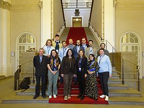 Die Studienreise wurde am Montag, dem 9. März 2026, mit einem Besuch des Katholischen Büros München fortgesetzt. Dessen Leiter, Herr Dr. Matthias Belafi, stellte der Gruppe seine komplexen Aufgaben im Zusammenspiel von Bayerischen Bistümern, katholischen Organisationen und bayerischer Politik vor. Im Anschluss fand ein rund einstündiges Gespräch mit Kardinal Reinhard Marx in der Bibliothek des Erzbischöflichen Palais statt. Theologische Themen wechselten sich dabei mit gesellschaftlich-politischen ab. So wurde über die Synodalität der Kirche insgesamt, wie auch den Synodale Weg in Deutschland im Speziellen, sehr lebhaft diskutiert. Dem Ausruf Kardinal Marx‘, der im Hinblick auf die Zukunft der Kirche das optimistische Wort „We are back“ prägte, folgte der nachdenkliche Appell an die Mitglieder des Jungen Forums: „Auf sie kommen immense Herausforderungen zu, die Demokratie, unsere Gesellschaftsordnung und die Freiheit zu verteidigen! Nehmen Sie diese Herausforderungen auch im Sinne Joseph Görres‘ an“, so der Kardinal. Mit diesen einprägsamen Sätzen endete das Gespräch, das einen der ersten Höhepunkte dieser Studienreise setzte. Beendet wurde dieser Studientag mit einem Besuch der Generalverwaltung der Max-Planck-Gesellschaft. Deren Pressesprecherin, Frau Dr. Christina Beck, stellte Geschichte, Struktur und Persönlichkeiten der MPG dar. Beeindruckend war zu erfahren, dass die MPG in der obersten Liga der wissenschaftlichen Einrichtungen spielt und zusammen mit der Harvard-University auf 31 Nobelpreisträgerinnen und -träger blickt. Im anschließenden Rundgang präsentierte Frau Beck faszinierende Bilder aus der Wissenschaft, so zum Beispiel ein präkolumbisches Federmosaik, das zu einer Federikone verarbeitet wurde: in einer Himmelsdarstellung des Evangelisten Johannes.