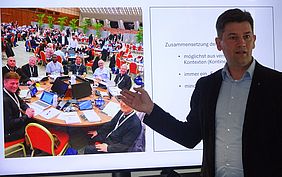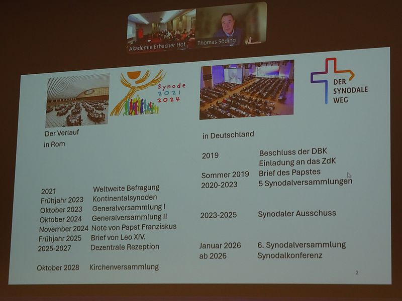 Ein besonderer Höhepunkt der Tagung war der “offene Abendvortrag” mit Prof. Dr. Thomas Söding, emeritierter Professor für Neutestamentliche Exegese an der Ruhr-Universität Bochum und Vizepräsident des Zentralkomitees der deutschen Katholiken (ZdK). Thomas Söding konnte zu diesem Vortrag mit dem Titel “Wohin will die katholische Kirche in Deutschland (und der Welt)?” nicht anreisen, war aber live zugeschaltet, was seinen Ausführungen zum synodalen Weg in Deutschland und zur Weltsynode in Rom nichts von ihrer Intensität und Spannung nahm. So plädierte Söding nachdrücklich für Reformen und Transparenz in der Kirche, worin er eine Hinwendung zur “Heiligkeit der Kirche” sieht.