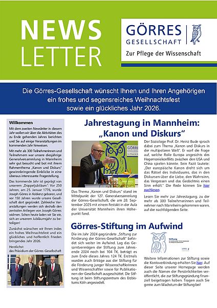 Zum Jahresende ist der zweite Newsletter der Görres-Gesellschaft für das Jahr 2025 erschienen. Sie finden den Newsletter, wenn Sie diesen Link anklicken.